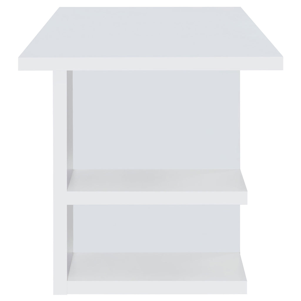 Enhance your workspace with this modern writing desk, featuring a sleek white finish and a spacious design for maximum functionality. The clean-lined silhouette offers a contemporary touch, while four open shelves provide ample storage for books, office supplies, or decorative items. The wide tabletop surface accommodates a large computer setup, ensuring a comfortable and efficient work environment. Designed for versatility, the open leg space allows for easy chair placement. Crafted from durable engineered wood and melamine veneer, this desk is both stylish and built to last. Key Features: • Sleek white writing desk with a spacious tabletop for a modern office setup • Four open shelves provide ample storage for books, supplies, and décor • Minimalist design blends seamlessly into contemporary and home office spaces • Sturdy construction with engineered wood and melamine veneer for durability • Open leg space offers comfort and easy chair placement • Perfect for home offices, study areas, or creative workspaces