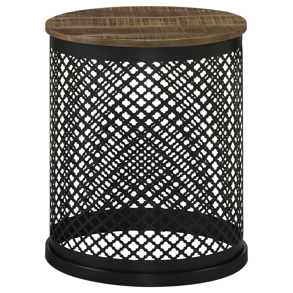 Blending rustic charm with industrial flair, this round accent table makes a striking addition to any space. The solid mango wood top, finished in a deep natural tone, highlights the organic wood grain for a warm, inviting look. The black iron drum base features an intricate perforated latticework design with a quatrefoil pattern, adding a layer of visual depth and texture. Whether used as a side table, nightstand, or decorative accent, this piece offers versatility and style to modern, industrial, or eclectic interiors.