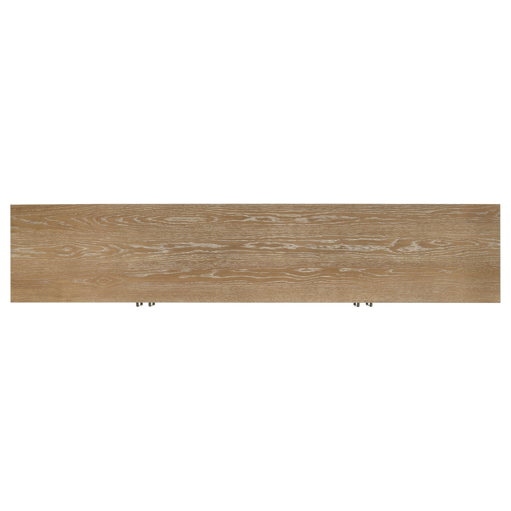 A celebration of craftsmanship and function, this expansive TV stand brings quiet charm to any living room or entertainment space. Framed in warm washed oak with glass-front cabinet doors, it offers a balanced blend of display and storage. Crafted from solid rubberwood, engineered wood, and white oak veneer, this console houses media components with ease, thanks to spacious shelving and built-in cord access that keeps everything neat and ready for viewing. Key Features: • TV stand with four glass-front doors and adjustable shelving for spacious component storage • Washed oak wood finish adds natural warmth and timeless casual elegance to any setting • Cord management cutouts keep media cables concealed for a clean and organized display • Classic antique brass pulls add a refined contrast to the contemporary frame design • Constructed from solid rubberwood, engineered wood, and white oak veneer for lasting strength • Media console accommodates televisions up to eighty-five inches wide with sturdy platform-style support