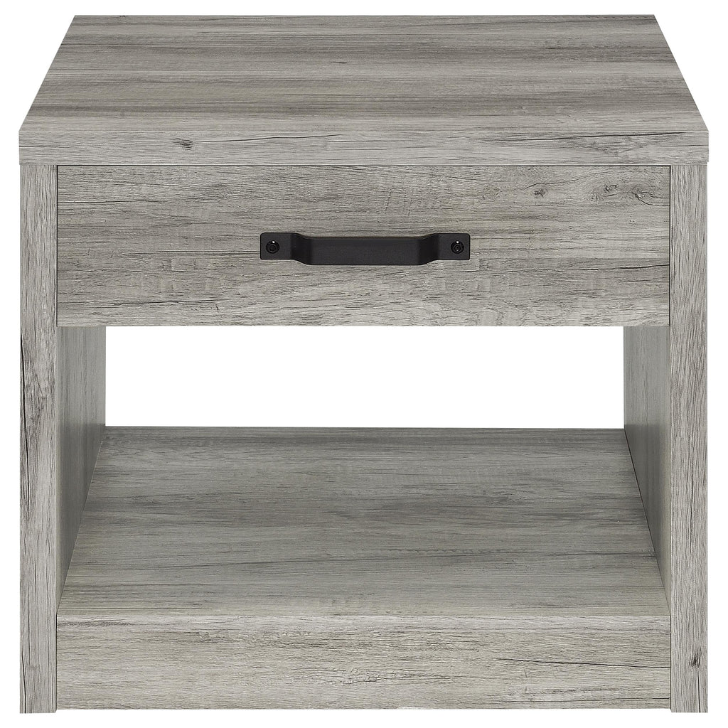 Bring rustic charm to your living room or bedroom with this versatile end table. Featuring a weathered gray finish over engineered wood and scratch-resistant veneer, it delivers a natural wood-look design. The table includes a spacious drawer with a bold black metal handle and an open shelf for additional storage or display. Its clean lines and practical design make it a perfect addition to casual and modern interiors. Key Features: • Rustic end table with a stylish gray wood-look finish that enhances its natural charm • Built from durable engineered wood with a scratch-resistant veneer for everyday durability • Spacious drawer with bold black metal handle provides hidden storage for essentials • Open lower shelf offers easy access and display space for books, decor, or more • Weathered gray finish with detailed wood grain texture adds rustic elegance • Functional and versatile, perfect for modern or casual living spaces