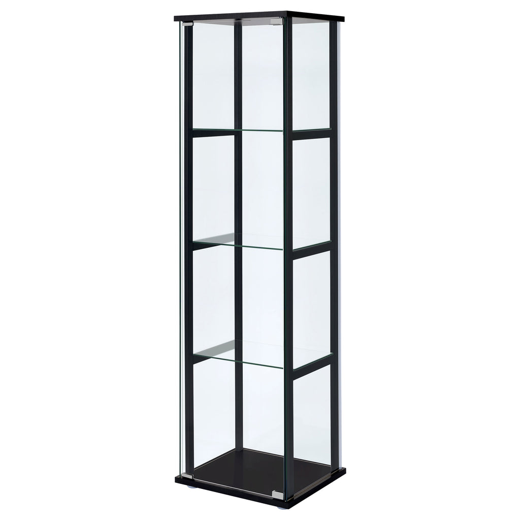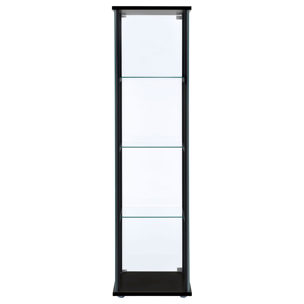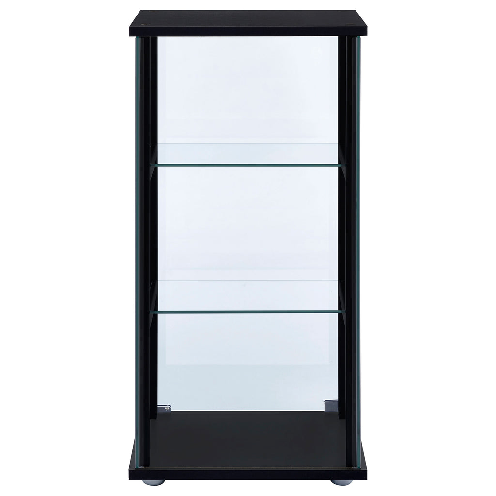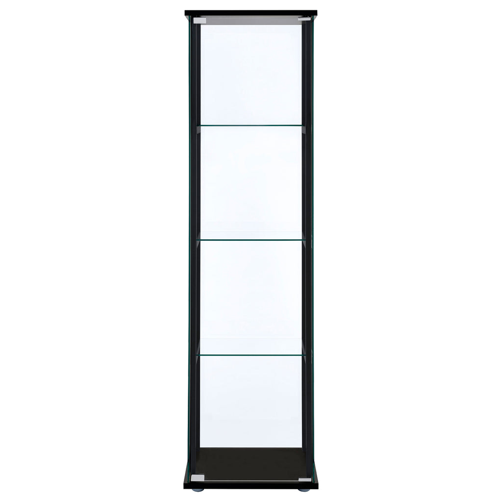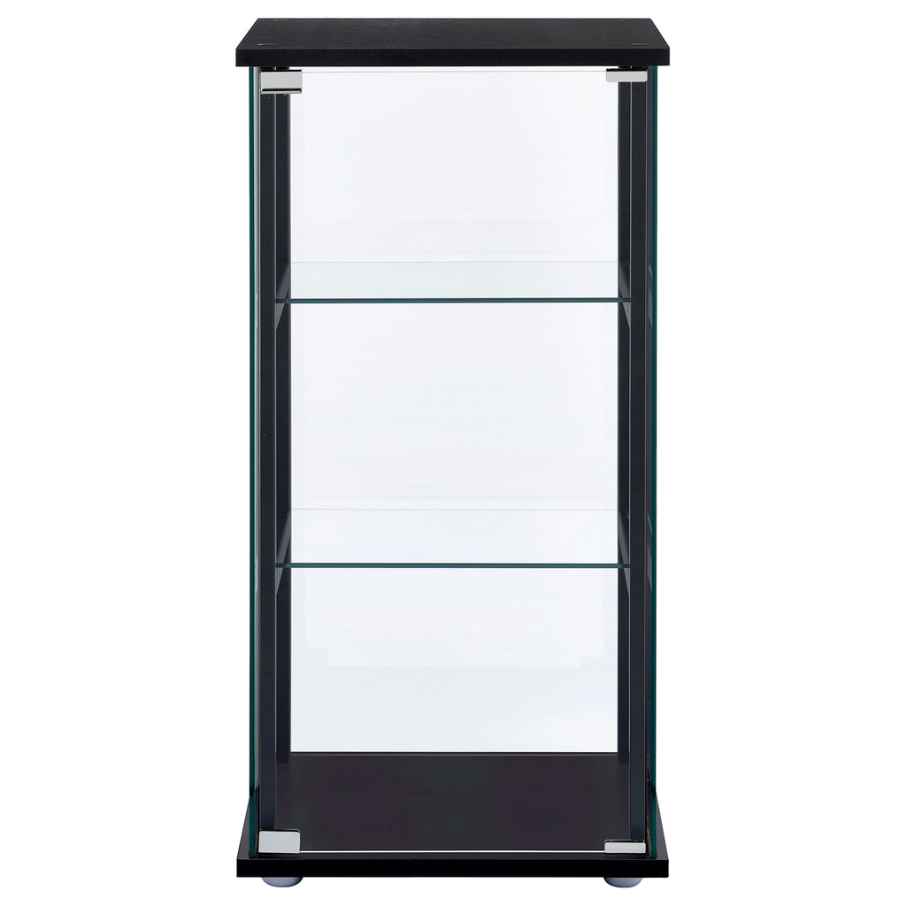 A modern version of a true classic makes a fabulous addition to a transitional space. With linear styling and a fresh look, this curio cabinet offers a perfect venue for showcasing treasured decor. Bold black tops a simple frame, top, and base. Tempered glass shelves create transparent space for display. Access its interior easily with push-to-open doors. Key Features: • Modern curio cabinet in black finish • One reversible magnetic push-to-open clear tempered glass door provides ease of access and strength • Three tiers of shelving for additional display space • Available in a variety of sizes • Glass, pine, particle board, and laminate construction