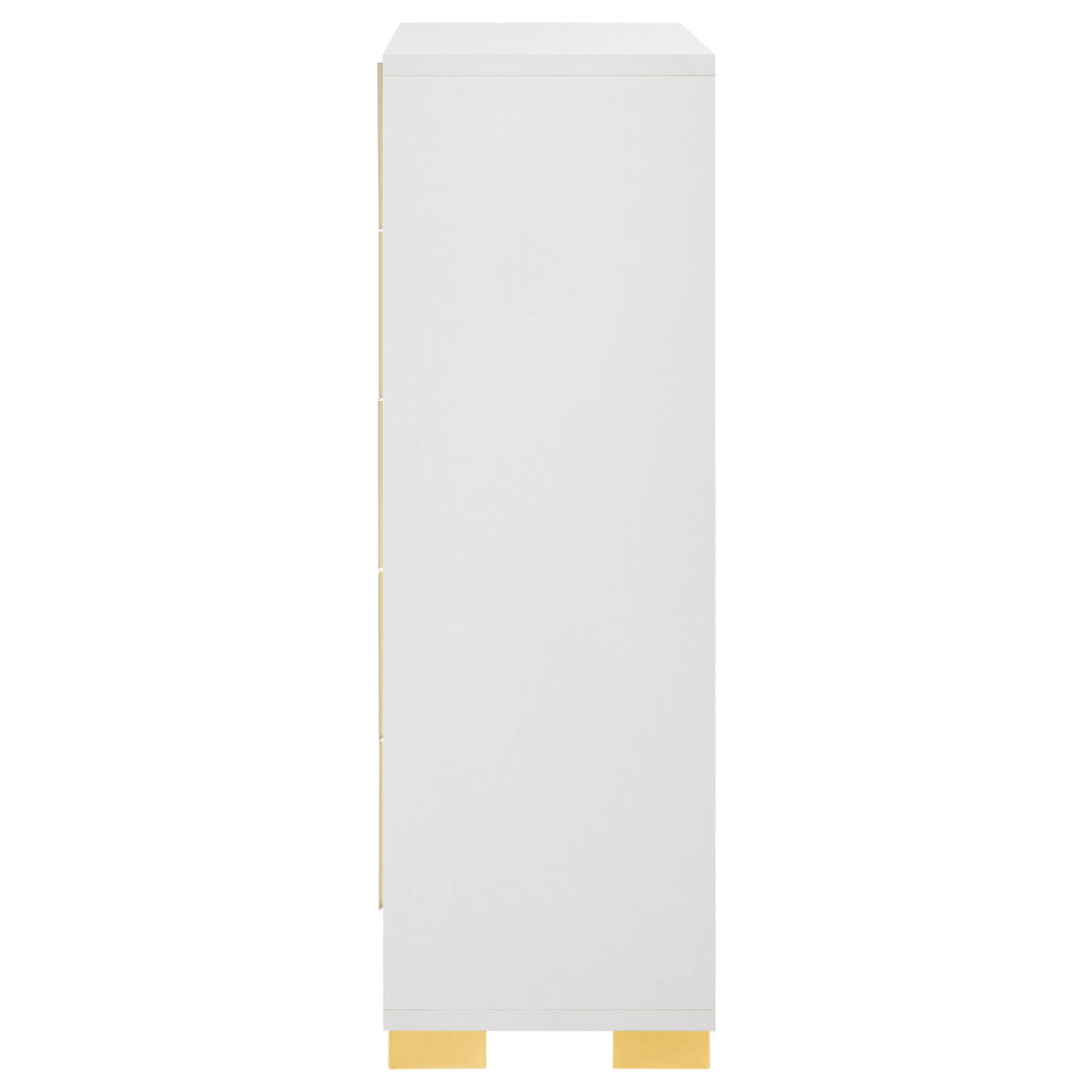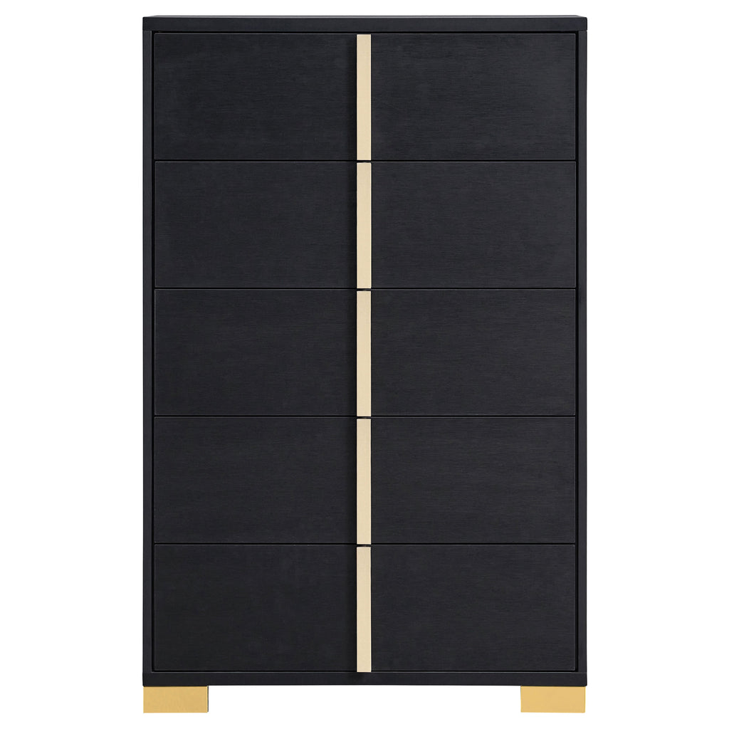 Minimalism never looked so elegant as it does in this elegant five-drawer chest, an excellent option for your updated bedroom ensemble. Modern design details produce a chic vertical chest with an Art Deco vibe and tons of storage space. Made of wood products, this five-drawer chest features a versatile finish with accenting from gold finish metal, placed carefully to emphasize a geometric linear effect. Store incidentals and accessories in drawers operating smoothly on center metal glides. English dovetail drawer construction embellishes this chest’s quality, as vertical gold metal drawer hardware offers a unique impact. Key Features: • Elegant five-drawer chest with modern design details and Art Deco vibe • Made of wood products with versatile finish and gold finish metal accents • Smoothly operating drawers on center metal glides with English dovetail drawer construction • Vertical gold metal drawer hardware for unique impact • Minimalist design with ample storage space