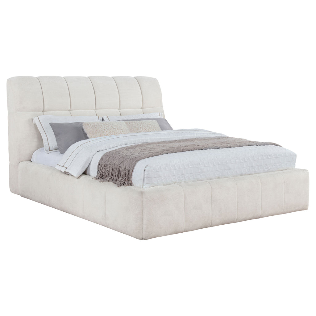 Tailored with bold lines and soft texture, this upholstered platform bed blends comfort with quiet strength. Vertical channel tufting runs along the headboard and foot rails, adding dimension and rhythm to the silhouette. Wrapped in plush fabric and fully slatted for support, it eliminates the need for a foundation. Crafted from solid and engineered wood, this bed invites modern serenity into any bedroom retreat. Key Features: • Queen platform bed with vertical tufting for subtle texture and visual rhythm • Cream fabric upholstery adds soft elegance with a light, airy modern palette • Slatted platform design supports mattress without needing a foundation • High headboard offers sculptural depth and a softly framed silhouette • Crafted from solid pine, engineered wood, and foam for strength and support • Perfect for minimalist or contemporary rooms with light, calming tones