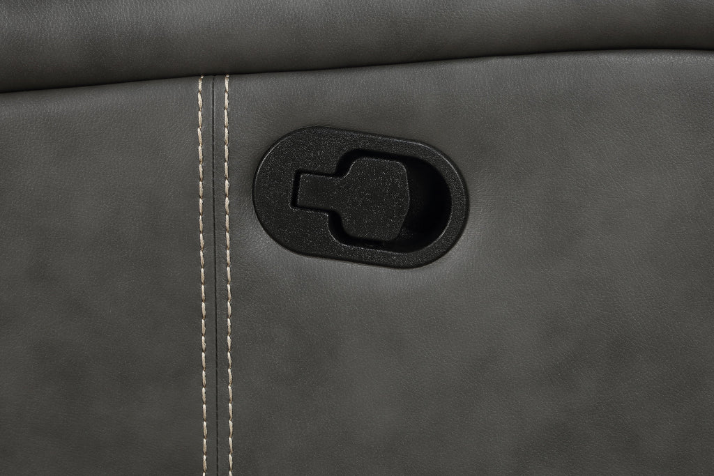 Relax in style with this transitional motion sofa set that blends modern and contemporary design. Each piece is upholstered in smooth grey leatherette with vertical topstitching for decorative detail and added dimension. Plush foam padding and pocket coil seating provide long-lasting support, while ultra-padded headrests enhance comfort. Manual reclining seats with a wall-hugger design maximize space efficiency. For added functionality, the loveseat includes a center storage console with dual cup holders._x005F_x000D_ Key Features: • Two-piece sofa set upholstered in smooth grey leatherette with vertical stitching • Manual reclining seats offer customizable comfort for daily lounging and relaxing • Wall-hugger mechanism saves floor space while allowing full recline extension • Plush foam padding with pocket coil seating ensures supportive durability • Attached cushions with ultra-padded headrests enhance everyday relaxation • Loveseat includes a flip-top storage console and two built-in metal cup holders