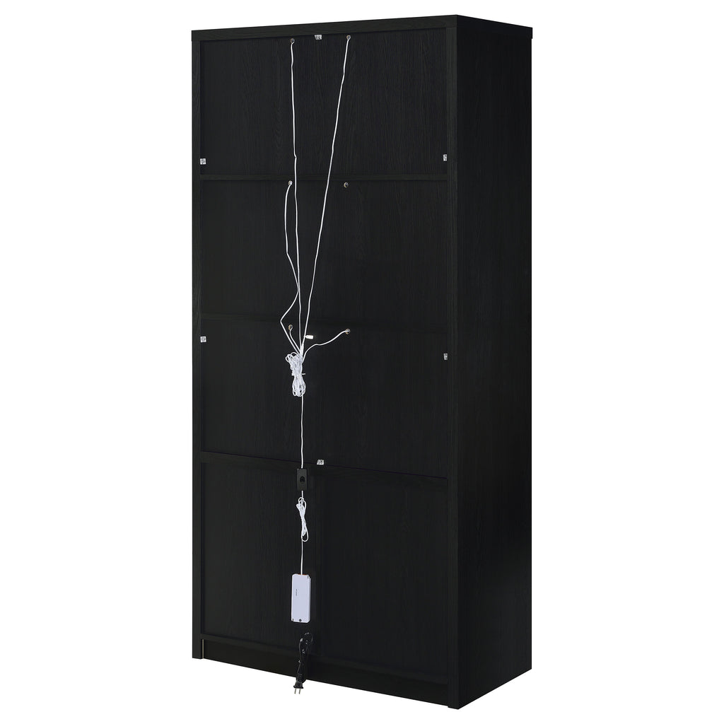 A dramatic silhouette and graceful arches come together in this striking display cabinet, where elegance meets purpose. Tall framed glass doors open to reveal a softly illuminated stage, casting warm light across treasured pieces. Below, concealed storage offers hidden utility behind panel doors, each compartment thoughtfully fitted with adjustable shelves. Cloaked in a deep black woodgrain, this cabinet brings quiet drama and timeless refinement to any curated space. Key Features: • Accent display cabinet with four doors including framed glass uppers and panel lowers • Black finish highlights the cabinet’s tall frame with modern depth and clean geometry • Upper doors reveal LED-lit display • Lower doors conceal dual compartments with two adjustable wood shelves inside • Arched glass doors soften the vertical lines with graceful contrast and elevation • Crafted from engineered wood, ash veneer, tempered glass, and laminate veneer