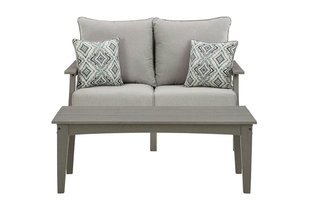 It’s the dawn of a new day for gray. Embrace the style trend with this loveseat and coffee table package. Crafted of HDPE material that combines the exceptional durability and weather resistance you need with the "wood look" you love, this timeless set takes alfresco living to a whole new level. The slatted styling on the table naturally sheds rainwater. Thick seat and back cushions on the loveseat are wrapped in our exclusive Nuvella® high-performance fabric that’s fade resistant, stain resistant and a breeze to clean.